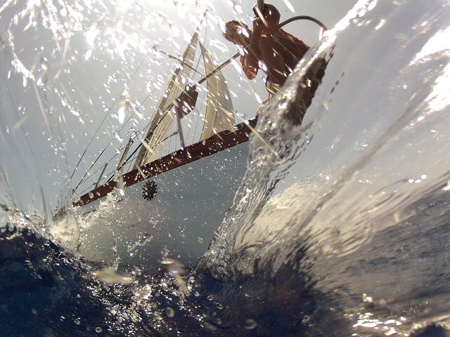 I stuck my GoPro onto the end of the boat hook for this one. Lucky timing! We’re now heading back north having had a few days off Tanzania. The wind picked up considerably and because we’d torn the leech of the genoa, had to use a No.3 jib. Still made a good 6 knots to windward though.