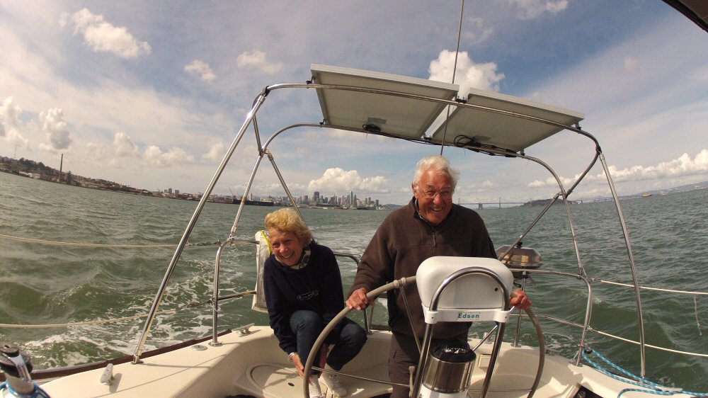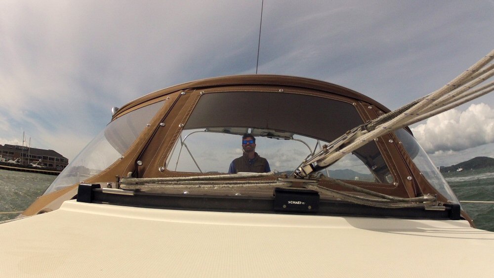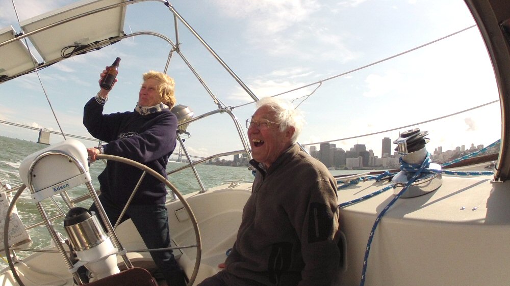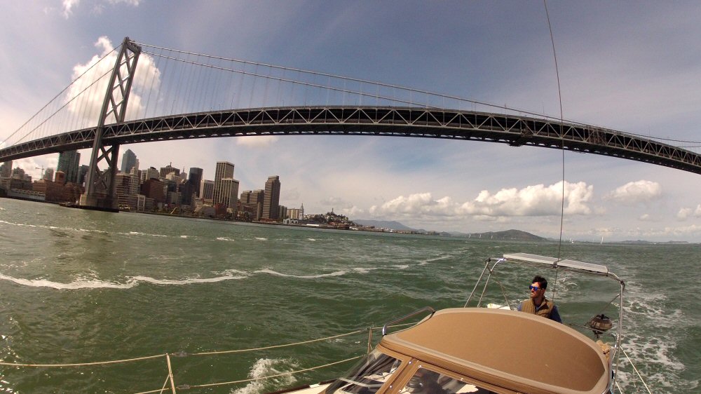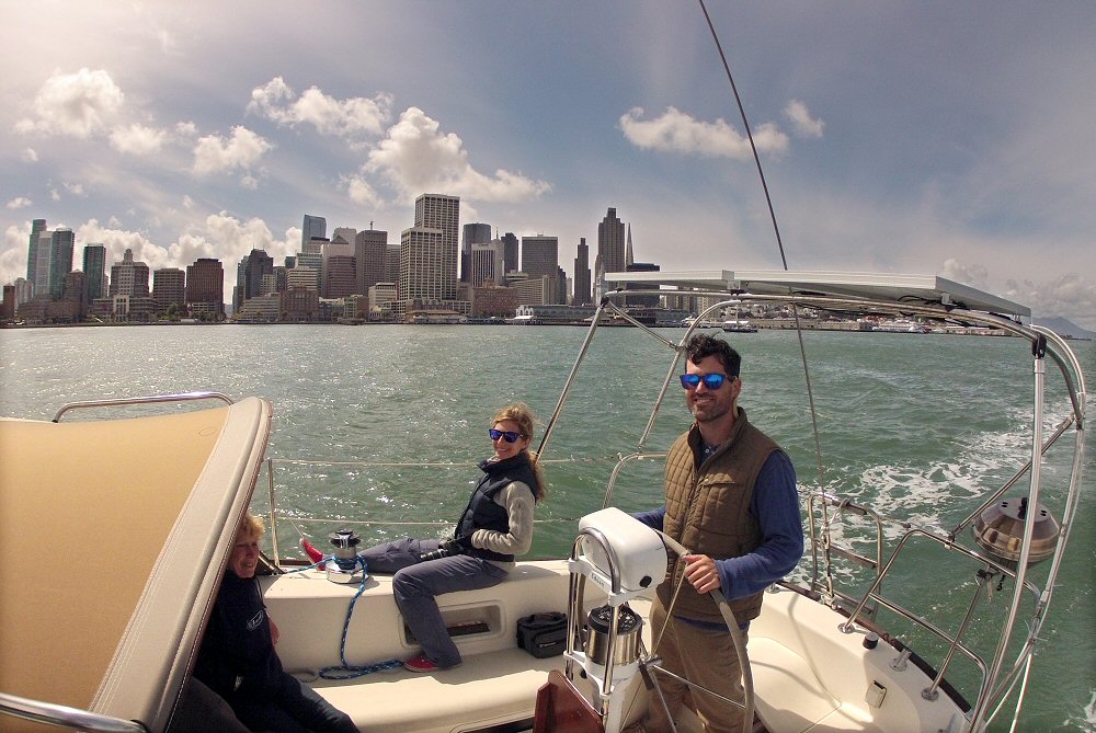 David’s first time at the helmPilot MikeEnjoying the wind, sun and ciderShooting for a Trader Joe’s commercialSF skyline from the southMike and Rachel looking comfy