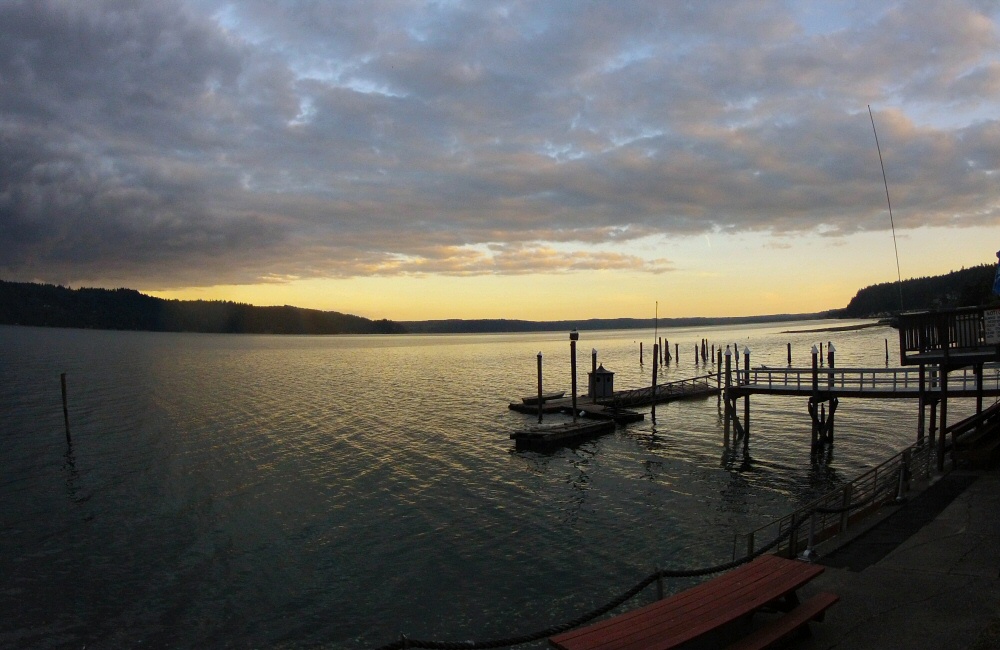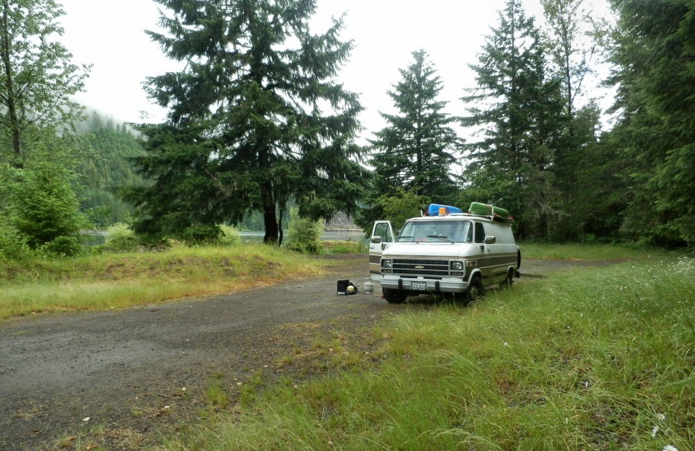 After a mediocre (but typically American-sized; huge) noodle meal at a roadside restaurant and a quick and dirty Wal-Mart stop to buy mosquito net for the van we found a motel in the small town of Hoodsport. Time to wash off the dirt from the ride this morning. Right on the edge of the small gravel beach, the Sunrise Motel has a wonderful view over the water, with its own dock that squeaks with every wave that comes through. We’re a long way from the open ocean here at the southern end of the Puget Sound. Seattle is to our east, across a number of estuaries, islands and waterways. We had no reason to stop in there, and generally want to avoid the big cities.