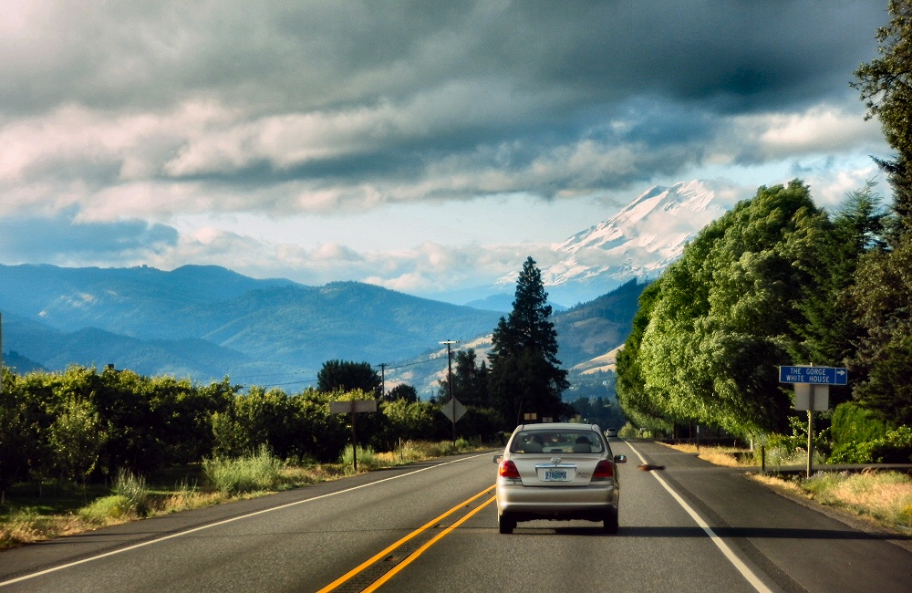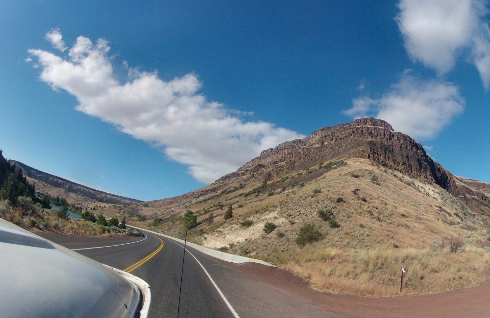 From Bend we headed north through Madras and over the Warm Springs Indian Reserve. I’m not quite sure what an Indian Reserve is; all we saw was lots of open land and yet again, new and impressive scenery. Beyond the Indian Reserve we headed up into the hills, into the cloud and rain again, before going over the summit at Barlow pass and down the Hood River gorge in the late afternoon light.