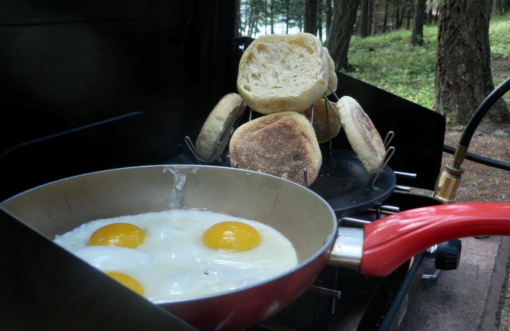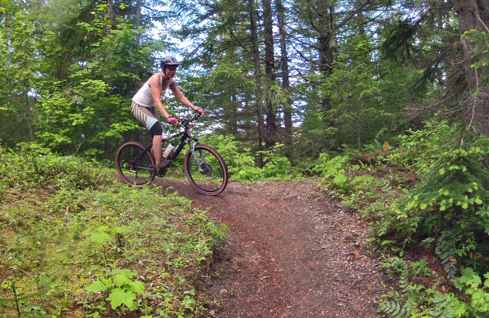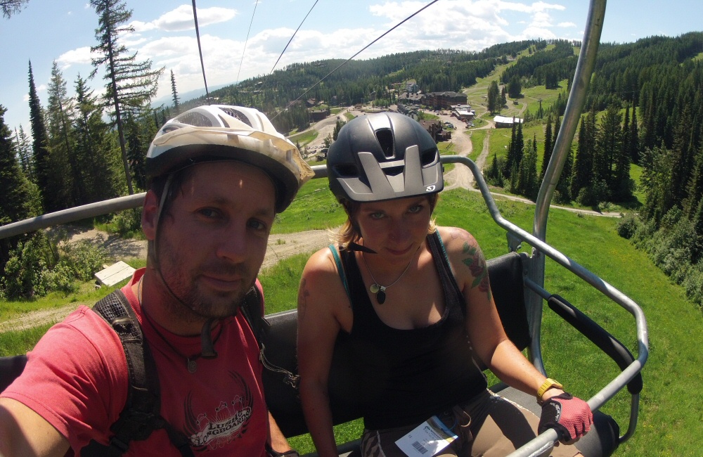 We put our new camp toaster through its paces; egg muffins with marmite for breakfast. Mmm. Then carried on south to Whitefish to hunt down a coffee shop and a laundry. The laundry was a couple of miles out of town, so while our clothes tumbled around we read the local papers, and discovered that the nearby mountain (innovatively called “Big Mountain”) had chairlifts and mountain bike trails open. That settled the plan for the afternoon! We gobbled down a crepe, popped into a huge mountain sports store to pick up some padded shorts for Rose, and then hit the hill mid-afternoon for a couple of hours riding.