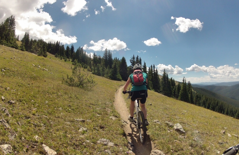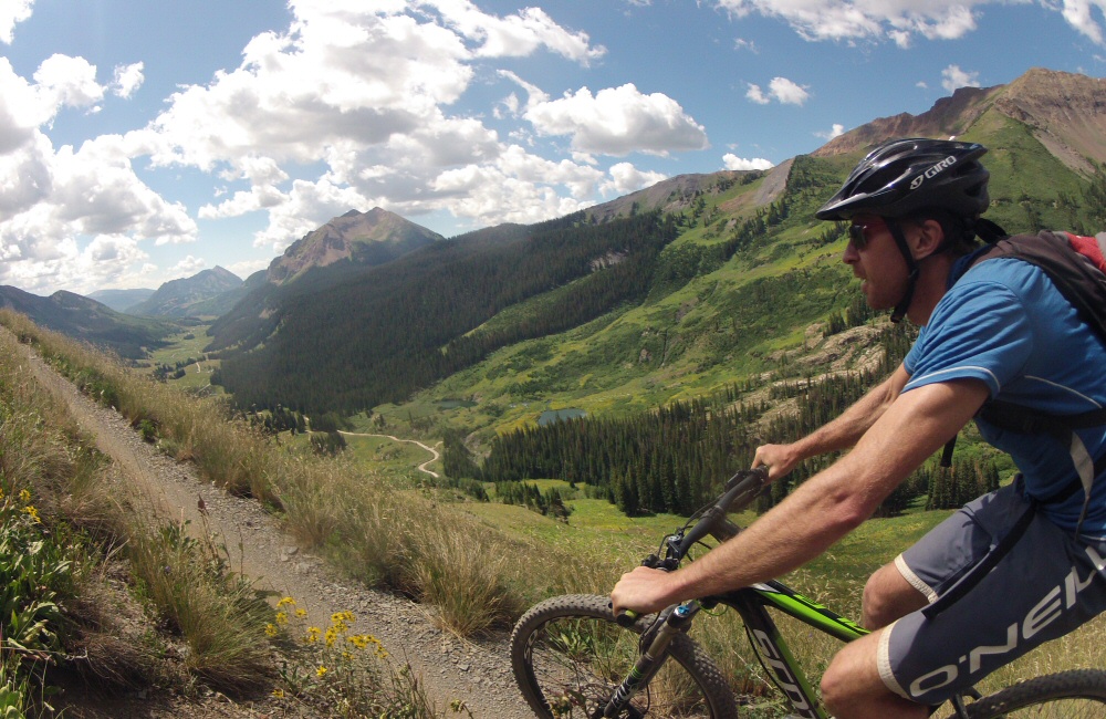 We’d come up this valley to be near a trail called the “401” – one of Colorado’s ten best mountain bike rides. We took the van a short way further up the road and parked up. The ride starts with a couple of miles of tough climbing – a bit of dirt road and then singletrack to the high point at about 11000 feet. Pretty hard work riding at this altitude, but incredible scenery. Then perhaps 6 miles of downhill, skimming along the side of the valley, looking out over amazing views, swooping and twisting through chest-high wild flowers. They say that the height of the wild flowers is a prediction for the depth of snow that’s going to settle in the coming winter. Left Rose and Helen at the bottom of the trail while we rode back up the road to get the van.