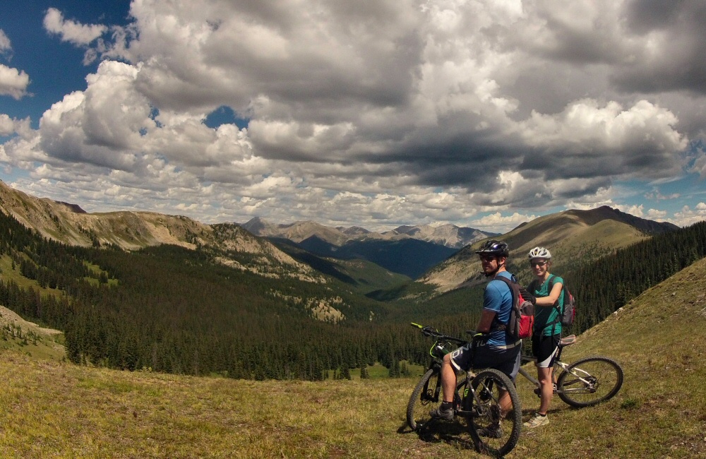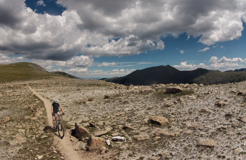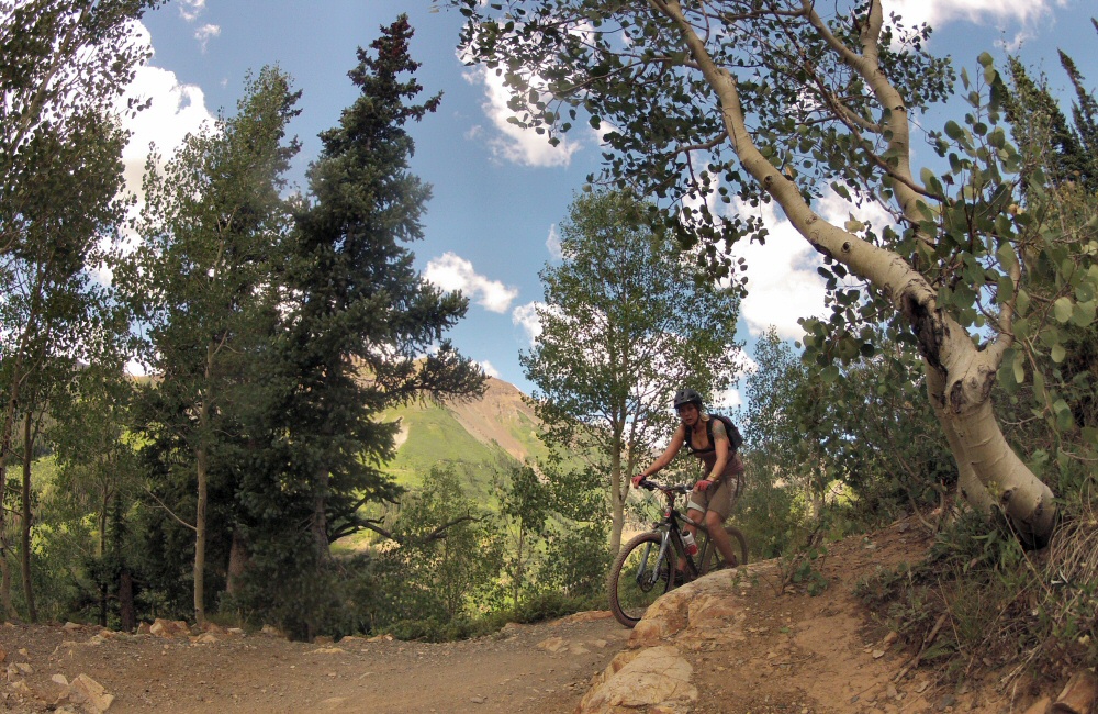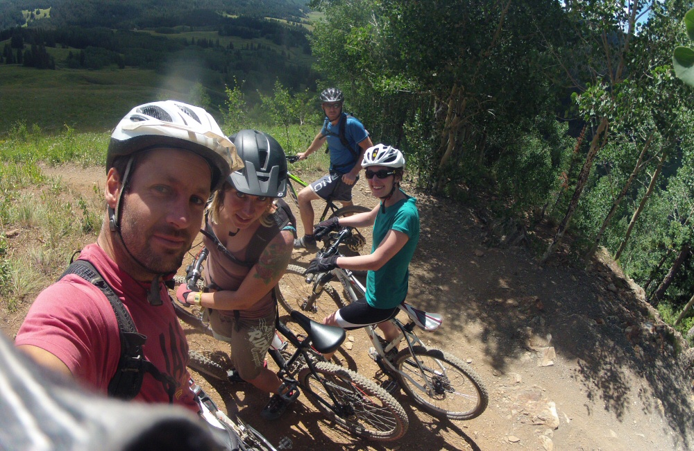 Introduced J&H to The Great American Breakfast at Paradise Café, then headed on up into the hills through Mount Crested Butte, to find somewhere to spend the night. Found a wild National Forest site, perched on the side of Gothic Mountain, along a bumpy dirt track. I’d spotted that the local ski centre was doing free chairlift rides in the evening, so we all had a few hours riding the downhill trails of the bike park. Thunderstorms around the local hills meant that the usual free-Friday night crowds weren’t around, and it wasn’t too hot. My bike is still just about holding together, it’s pretty old and tired now. No idea what I’m going to do with it when we go through the next phase of selling / giving things away in September, to thin possessions down for our trip south. I managed to get two pinch punctures during the evening, broke a tube valve, and a pump. Awesome riding though – typical bike park trails – a range of smooth swoopy berms and rougher technical bumpy stuff through aspen groves.