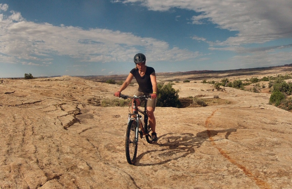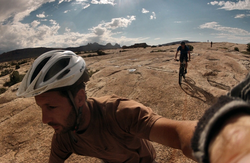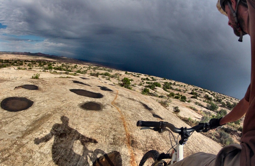 After setting up camp in town at Slick Rock Campground, the temperature had dropped a bit so we headed out for a ride at the “Bar-M” trails area just north of town, ending up doing the Circle-O loop – following a painted line on the slickrock for a few miles. A big storm was drenching the Arches National Park and the El Sal mountains to the south, but it rolled on past without hitting us.