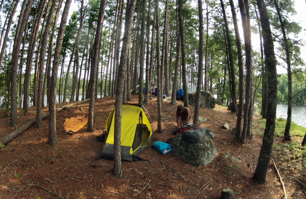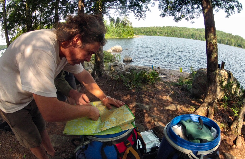 Thunder clouds marched over the sky in the afternoon, and as they approached the wind strengthened and changed to dead ahead, so we pulled into the side of the lake while the storms passed over. Heavy rain fell in front and behind us, but we got away with just a light shower, while Oli read the history of the park to us from the back of a map we’d found on the side of the trail. I hope the previous owners of that map had a spare … this is not a place to get lost! We carried on down McAlpine Lake and squeezed in a couple more portages before the end of the day (marked as “33” on the map). Emerging onto the water at the other end, we could see that all the obvious camp spots were taken, so we paddled around in the dusk, and then decided on a small island with what looked like a clear spot on the summit. Turned out to be a great site, with lots of wild blueberries to enjoy with breakfast.