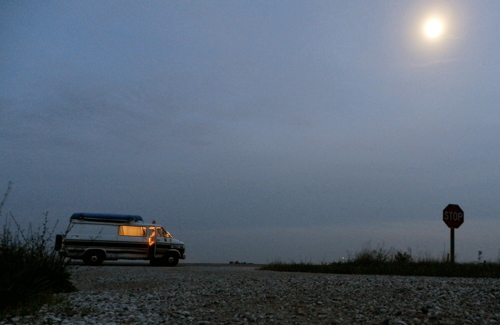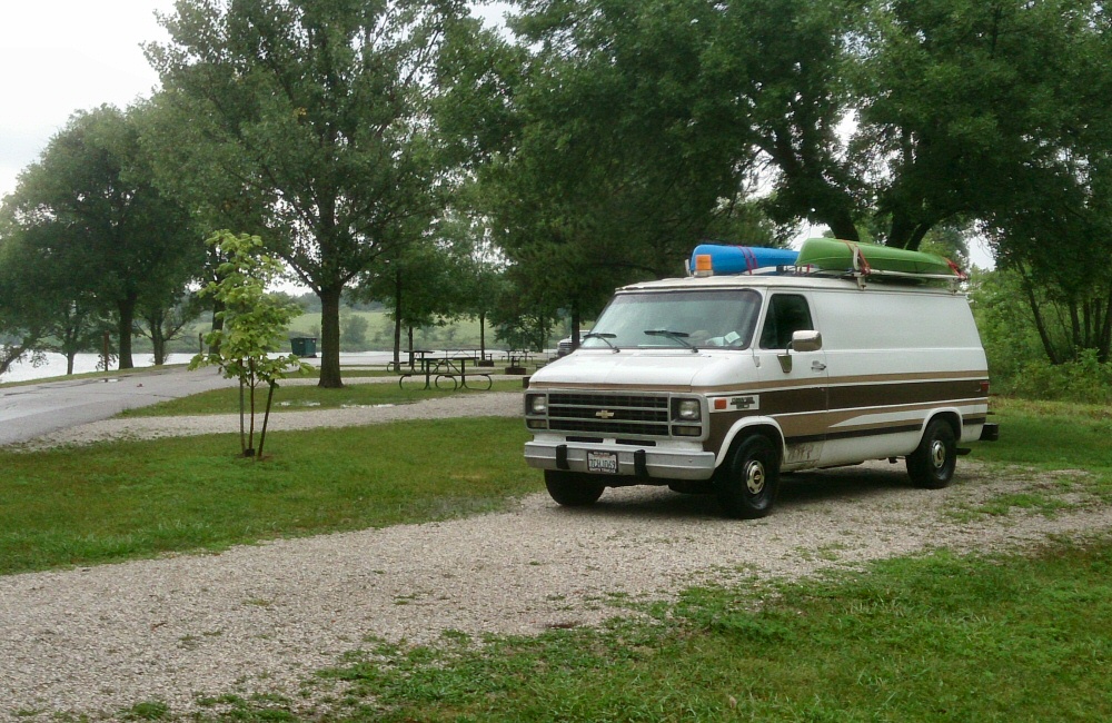 In camp, at Prairie Rose State Park, the rain begins. We’d eaten at a small-town bar in Panoma, so we’d arrived late, and just went to bed. At midnight I was woken by a splitting crash just outside, and fat heavy raindrops on the van roof. Thunderstorm!