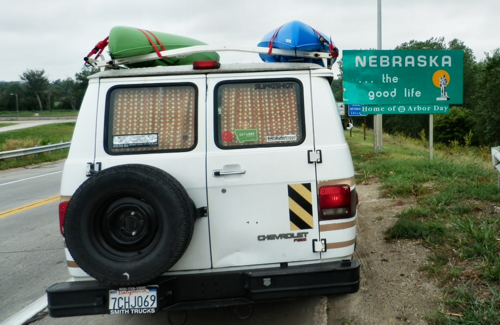 It’s now Thursday, we’ve just crossed the Missouri River, the border between Iowa and Nebraska – heading west. Agriculture is definitely numero uno round here. Towns are full of ag equipment dealers, selling all shapes and sizes of huge machinery. There’s a general store, a gas station, and some houses. We felt all eyes on us as we walked in the door of Corner Café in North Bend – “you’re not from round here” … the coffee was shocking so we’re now stopped in Grand Island, Nebraska, for a real one. Looks like we could be in Denver late tomorrow if we keep on truckin’.