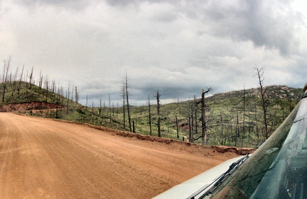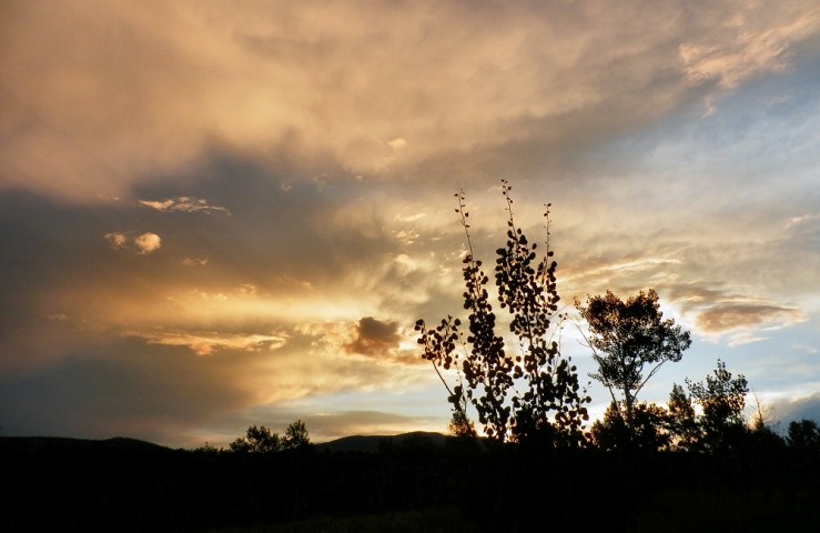 So we came up with a new plan. Across the mountains to another State Park. We took an unpaved road up onto the hill which wound its way through empty wilderness and dead fire-destroyed trees for miles and miles. Every now and then we passed a parked truck, where a couple of guys were shooting guns – I assume at targets. We also passed a number of mountain bikers loaded with gear. Stopping to chat briefly to a chap at a junction, we learnt that they were part of a 500 mile race from Denver to Durango. Hardcore. Pretty miserable for them this afternoon though – the skies opened and poured with rain, turning the dirt road into a river and making for some slippery driving. Pretty dramatic though. We even passed an area where it looked like it had snowed, or maybe hail. Eventually we ended up at Eleven Mile State Park, surrounding a reservoir. The setting sun dropped below the dark cloud cover and gave us an awesome light show.