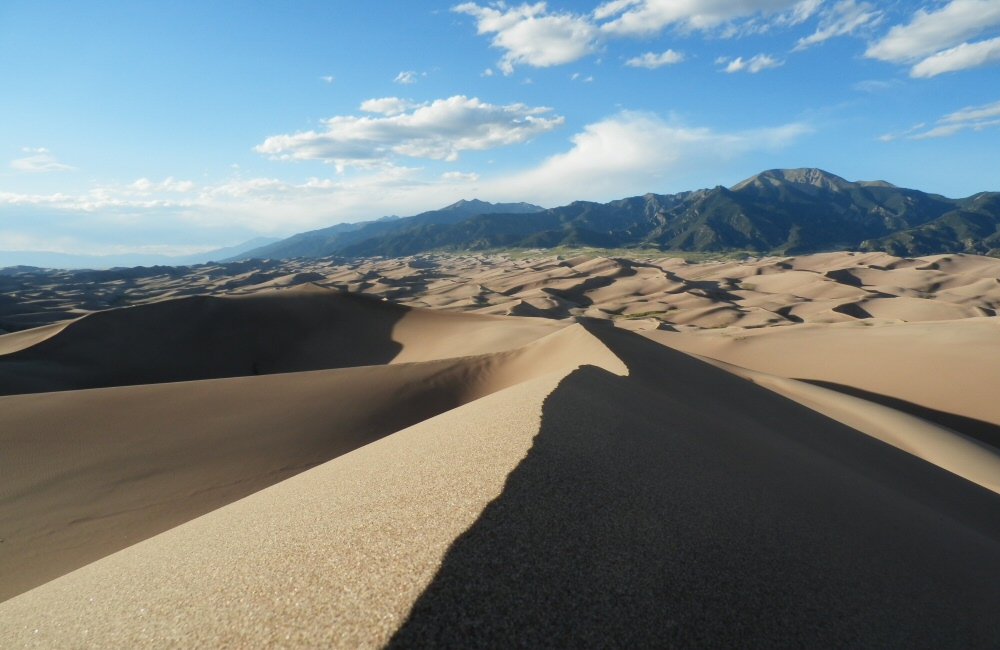 South again, to Sand Dunes National Park. A dramatic drive across huge, open plains with the Sangre de Cristo Mountains rising gradually from the valley floor on the left. In the distance, nestled at the foot of the hills, we could see the sand dunes as we approached. All the sand from the surrounding mountains gets washed into the valley, then the regular strong wind blows it all down to the corner where the huge dunes form. We set up camp, waited for the sun to chill out a bit, then hiked up the dunes to watch the sunset. Way across on the other side of the valley, a couple of thunderstorms were rolling southwards, making for a pretty atmospheric evening. We decided that we liked this camp so much that we’d stay another night, so we spent a day relaxing, reading, and had a wander up the river that runs along the foot of the dunes.