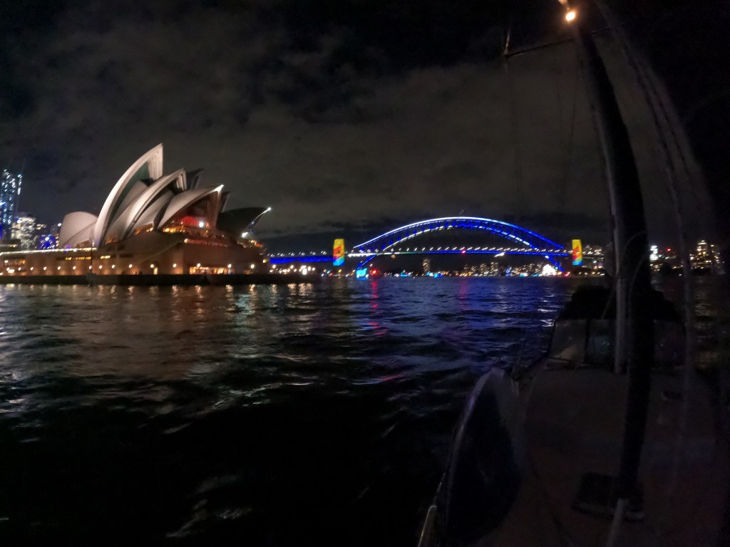 Our last night in Sydney was spent at anchor by the opera house after a tour of the “Vivid Sydney” lights in the dark.