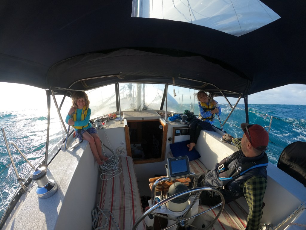 It’s been like this for a few days, and I’ve figured out a perfect combination of sails to deal with the changing conditions. We still have the 3rd reef in the main, which we don’t need to touch at all. The storm jib is hoisted and sheeted in tight. When the wind’s up in the thirties, Rafiki will power along at four or five knots, with the centre of effort low and centred in the boat so she doesn’t pitch and dive into the random waves that sometimes rise cheekily in front. The gusts of 40 knots or so push our speed up to six or seven; still not overpowered, but a bit creaky and noisy down below. The storm jib is working out way better than a partially rolled genoa, which, having the power coming from way up high and forward, makes for a slamming, uncomfortable ride. When the wind drops off and the waves mellow out, we unleash as much extra power as we need just by unfurling the genoa outside the storm jib.