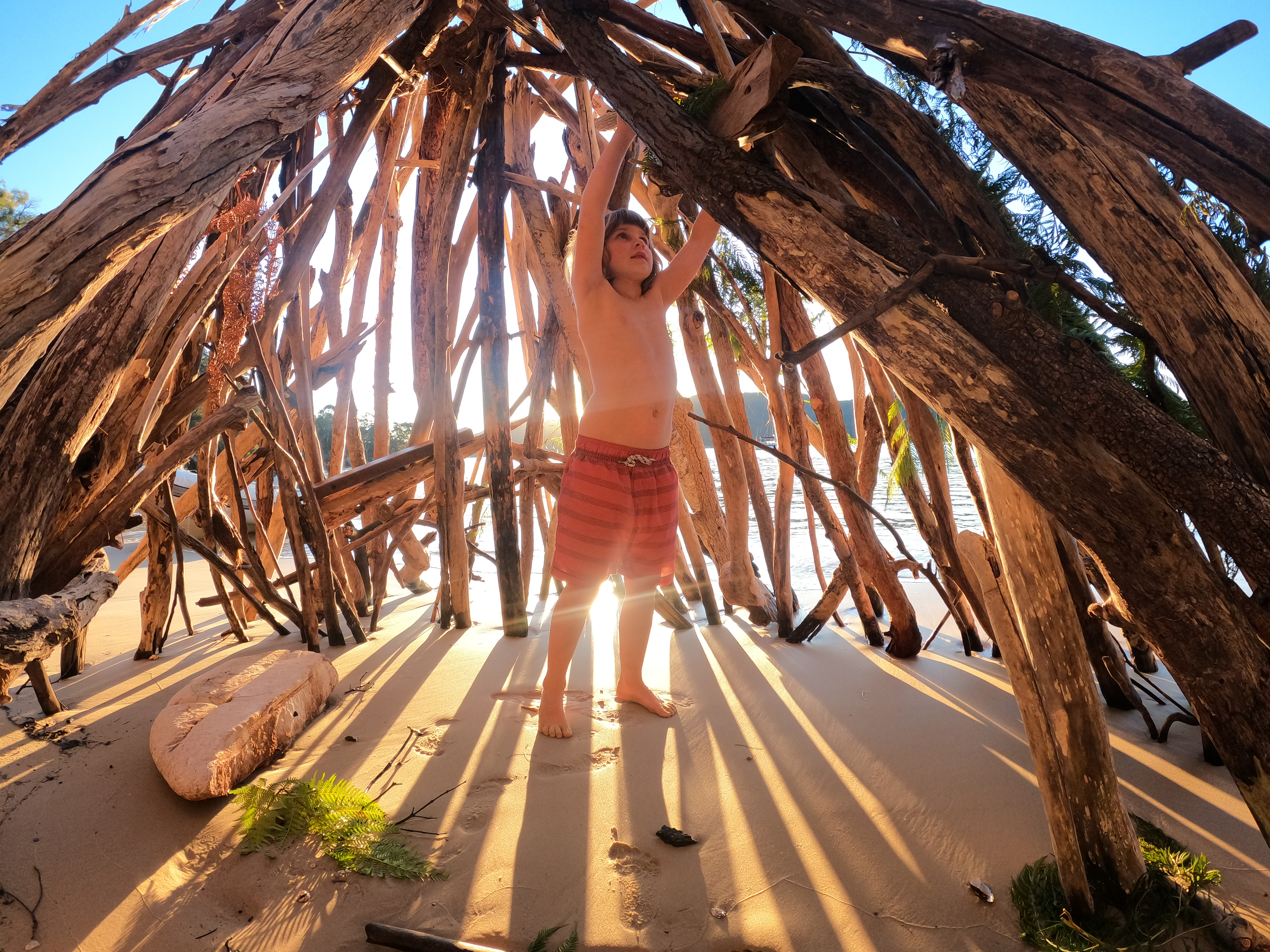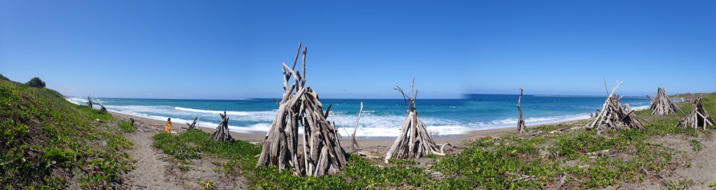 Onwards east along the coast to the Sigatoka Sand Dunes – even though it was first thing in the morning, it was too hot for us to take Tilly on the full dune walk (she was pretty tired from the previous day playing and swimming) but we managed a small loop through the woods and along the beach, where over the years people had built lots of driftwood tipis.