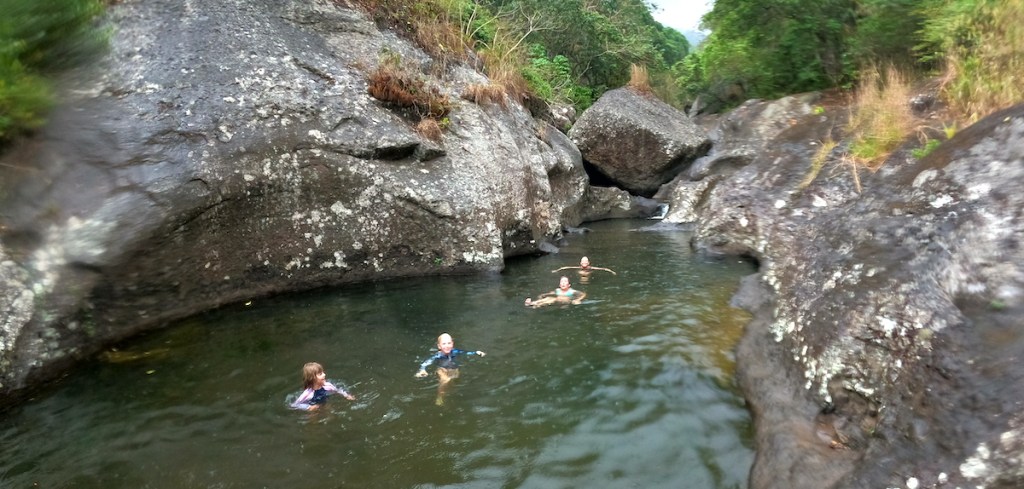 Headed up into the hills with Adelle and Sierra to find some waterfalls. An exciting off road trip in a not-offroad car, into the clouds. Hundreds of flame trees around with bright orange flowers. Smell of burning and smoke; lots of fires burning around the countryside, keeping the brush down; this is what we could smell as we approached from offshore.