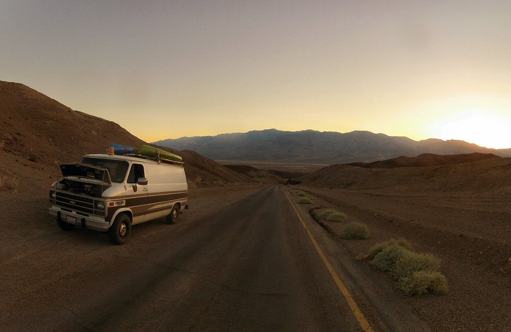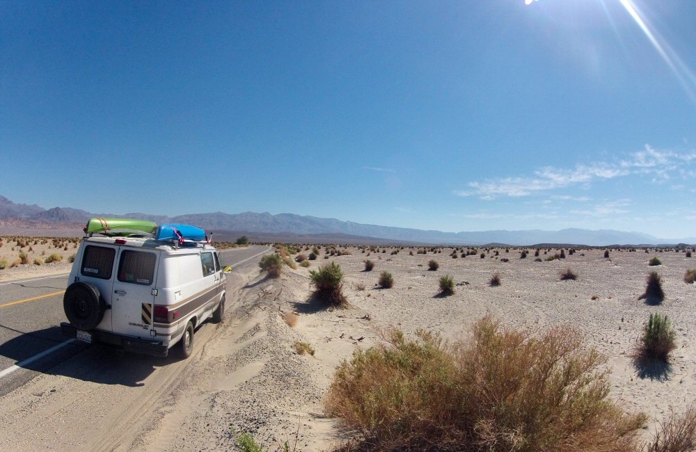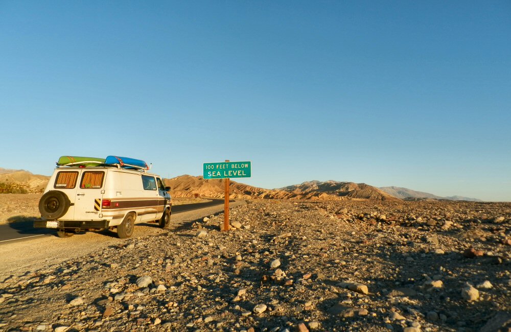 Eventually, late afternoon, it was time to get going. It’s not a long drive into Death Valley from Las Vegas, just a few hours through hot, arid desert. We arrived at the visitor centre at Furnace Creek where the temperature was 117F; over 47 centigrade, at 6pm! We made a dash up the valley to catch the sunset, and then found a campground.