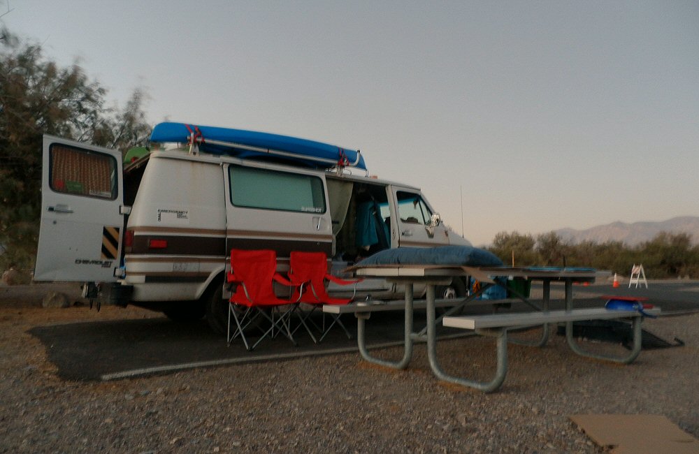 Woke up feeling surprisingly refreshed, considering I’d spent the night on the picnic table outside, in an attempt to stay in the breeze and keep cool. “Breeze” makes you think of a cool, gentle wind – but here it’s more like standing in front of the door of an open furnace. In fact the campsite is called Furnace Creek… but I think that might be because of the borax mining and processing that used to go on here rather than anything to do with the temperature. Camping in Death Valley in August eh. Nutters. A guy nearby started working with a chainsaw at about 5am – the coolest time of the day.