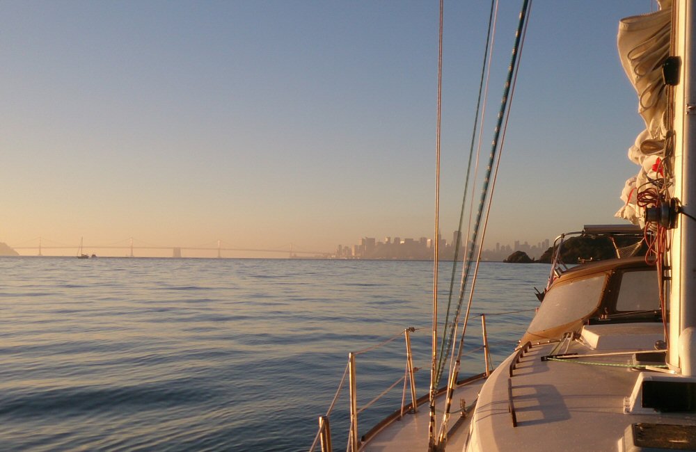 Last weekend we came over here to Sausalito to pick up Shane and Amanda for a weekend of sailing, and to make sure everything was working OK on the boat. New dinghy, new outboard engine, spinnaker and chart plotter all needed a shake-down. All systems go! For our tender, we ended up buying a Portland Pudgy, which is a hard plastic boat that, with an inflatable “exposure canopy”, also doubles as our life raft. Unsinkable, unbreakable, and no worries about non-inflation. I’ve heard too many stories about inflatable rafts not opening, or leaking, having spent months baking in their canister on deck. It’s a load heavier than I was expecting, and the original plan of storing it on the foredeck was going to be troublesome, so on the way back from work last week I popped into the local used parts shop to see if they had any davits (crane arms which fix on the stern of the mother ship). They did! So Thursday and Friday were consumed by a last-minute heavy engineering project to get them installed, with monster backing plates, and some custom stainless steel brackets. It’s now easy to drop and hoist the dinghy. And now that we have the extra weight on the stern to balance the chain and anchor on the bow, the boat has almost leveled off.