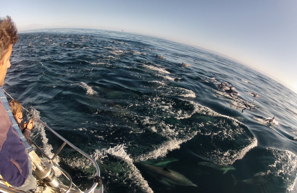 Ali and I took casual turns on watch through the night, Rose taking some rest below, not feeling too hot after the early bumpy ride. Our first Pacific dawn was pretty good – the sun very briefly splashing the bottom of the clouds with pink before poking its head up over the land.