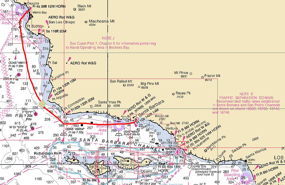 But within an hour or two, the engine is off, the sun is out and we’re sailing again. We’re due to round Point Conception late in the afternoon – the “Cape Horn of California”. It’s got a reputation for being gnarly, with strong winds and lumpy seas, and marks the beginning of the warmer and calmer waters of Southern California. We didn’t quite make as far as the point before dark – at Point Arguello (the point before Conception) I headed below for a couple of hours rest before the night ahead and Rose took command of the ship, sailing along at a decent 5 knots under just the full jib. I fell asleep instantly, and before I knew it, a couple of hours later in the early hours of the morning, we were around the corner and into the Santa Barbara Channel, dodging oil rigs. My turn on watch again, keeping the stars and waves company for the rest of the night.