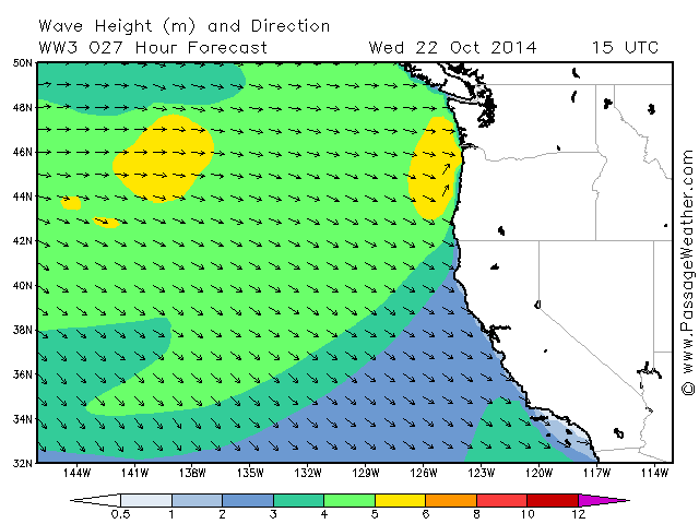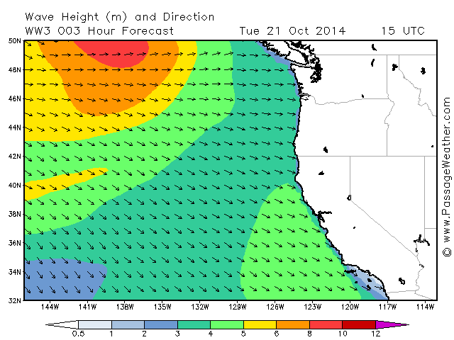 Here’s what the wave forecast looks like for today (bright green : 4-5 metre swell off the coast of Big Sur, central California):