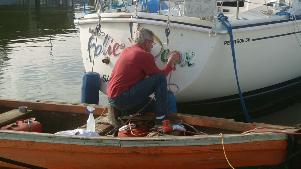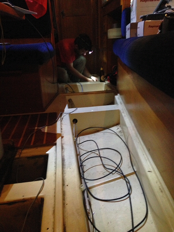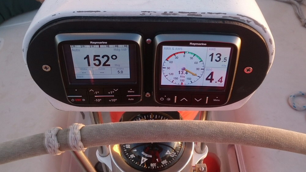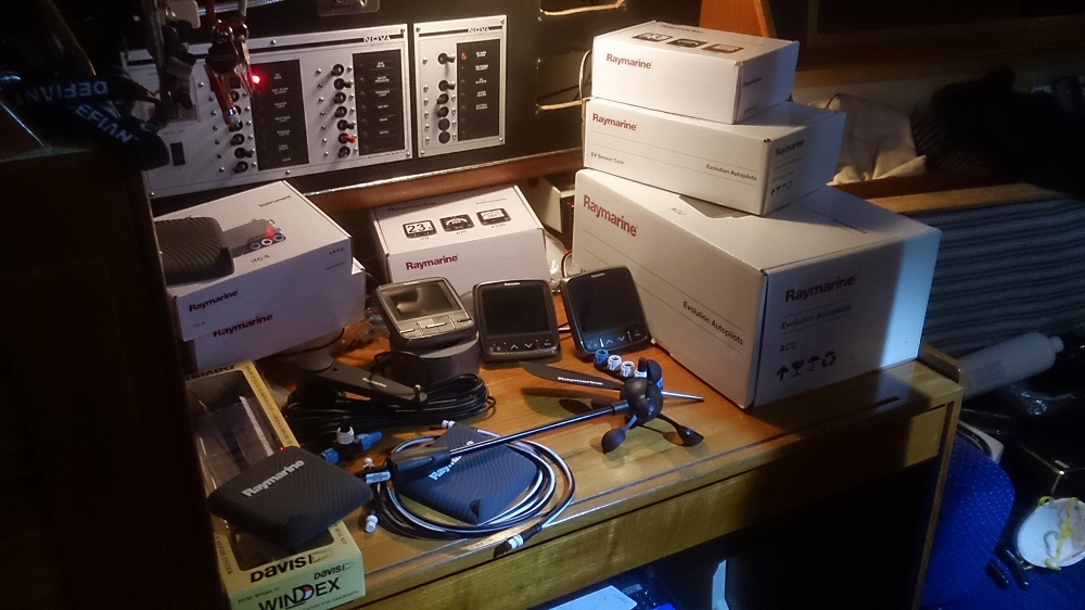 The solar panels are sat by my desk at work waiting for an opportunity for me to swing into the city with the van and pick them up. The other stuff should arrive next week, but I’ve managed to get a few things ready ahead of time. I bought a small car battery to use as the starting battery, which means I can wire the two existing large deep-cycle batteries in parallel and double the useful capacity for everything else – the fridge, lights, autopilot, instruments … so we’ve about 230 Amp-hours there now. From my workings we’ll be using about 100 Ah per day whilst on passage with all the gubbins on and lights at night, so even with the panels giving full power for about 6 sunny hours we’ll still need to run the engine every day to keep the batteries healthy. At anchor when we’re not using navigation lights and autopilot, the solar panels should keep at least the fridge running.